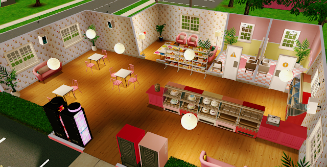Alfred arrived at Tasty Treats. It's very pink, his favorite color. Right now there's only cakes and decorative baked goods. After he improves his cooking skill he can sell his own goodies.
